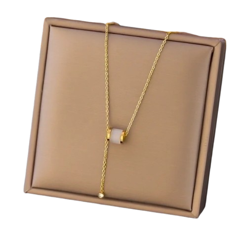 O Colar aço inoxidável 304, banhado a Ouro 18K, apresenta um design delicado e contemporâneo que encanta pela sua originalidade. A peça central é um pequeno cilindro em tom branco, envolvido por um aro dourado que cria um contraste sofisticado e luminoso. A partir dele desce um cordão pendente, finalizado com um pequeno ponto de brilho que acrescenta movimento e elegância ao colar. Produzido em aço inoxidável hipoalergénico, mantém a cor e o brilho mesmo com o uso diário, garantindo durabilidade e conforto. Imagine-se a usá-lo para dar um toque moderno e refinado ao seu look — um detalhe único que transforma qualquer outfit com subtilidade e charme.