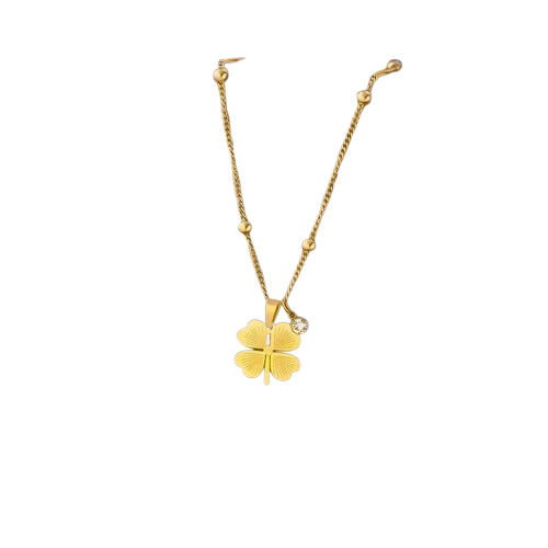 Este colar em 304 Aço Inoxidável, banhado a Ouro 18K, é a combinação perfeita entre delicadeza e simbolismo. O cordão fino, adornado por pequenas bolinhas ao longo de toda a peça, cria um brilho subtil e elegante que complementa qualquer look. O charme especial está nos seus pendentes: um trevo de quatro folhas — símbolo de sorte e boas energias — e um ponto de brilho que reflete a luz de forma delicada. Produzido em aço inoxidável hipoalergénico, mantém a cor e o brilho mesmo com o uso diário. Imagine-se a usá-lo para acrescentar um toque minimalista, feminino e cheio de significado ao seu estilo.